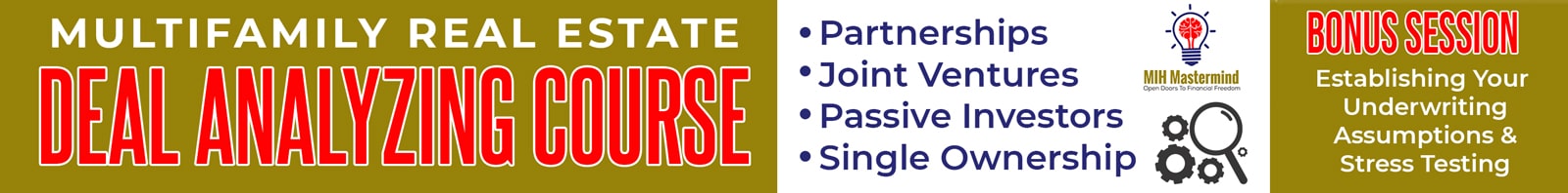 The MIH Deal Analyzing Course is geared towards the following investors: Partnerships, Joint Ventures, Passive Investors (Limited Partners) and single ownership.